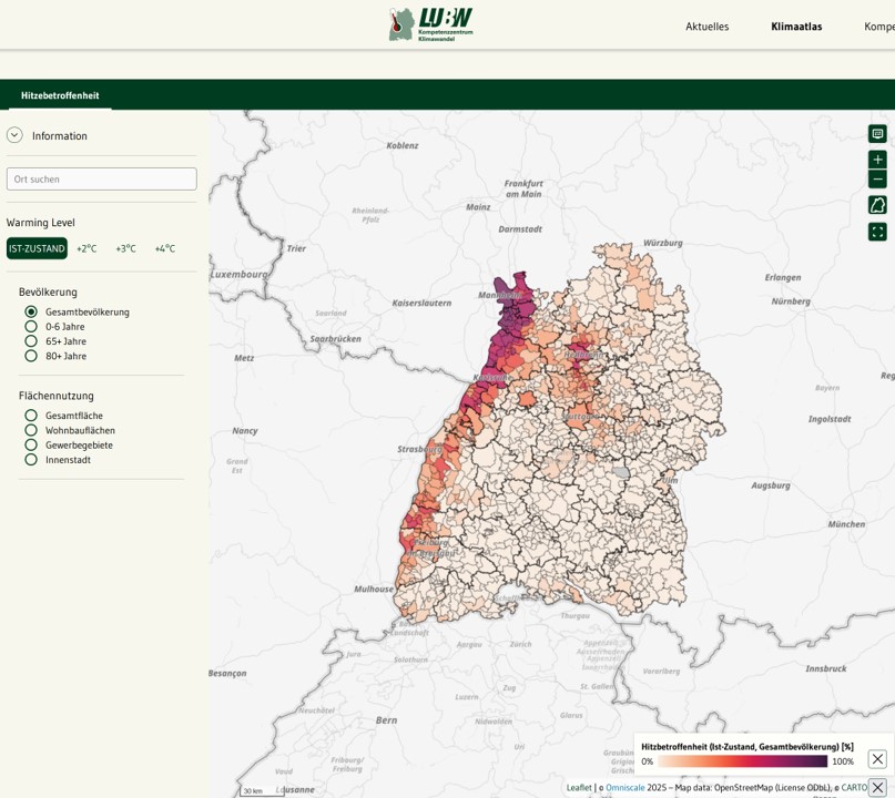 Der Anfang 2025 online gestellte Klimaatlas BW ist die zentrale Informationsplattform zum Klimawandel für Baden-Württemberg. Er bietet insbesondere Kommunen und