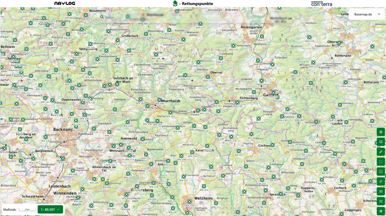 Klicken Sie auf die Karte, so öffnet sich die KWF-Rettungspunkt-Übersichtskarte für den Welzheimer Wald und Umgebung.